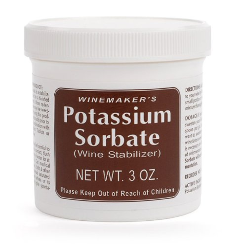 About This Product: (Ps210) Potassium Sorbate, Sometimes Called "Wine Stabilizer", Is Added To Finished Wines Before Bottling To Reduce The Possibility Of Re-Fermentation. It Is Strongly Recommended That Potassium Sorbate Be Used In Any Wine You Intend To Sweeten Or Any Wine That Is Still Sweet After The Fermentation Completed. Potassium Sorbate Is A Yeast Growth Inhibitor. It Will Not Stop A Fermentation That Is In Progress, But It Will Stop A Fermentation From Re-Starting. Re-Fermentation Is Something That Can Occur Even Months After The Wine Has Been Bottled. Small Amounts Of Yeast, Not Visible To The Naked Eye, Can Later Become Active If Bottle Temperature And Other Conditions Become Right. For Best Results, Use Potassium Sorbate In Combination With Either Campden Tablets Or Potassium Bisulfite.Directions: Add The Potassium Sorbate To Your Wine Prior To Bottling. First, Dissolve It In A Small Portion Of Wine. Then Stir The Mixture Thoroughly Throughout The Entire Batch.Dosage: If You Do Not Intend To Sweeten Your Wine, Use 1/4 Teaspoon Per Each Gallon Of Wine. If You Intend To Sweeten Your Wine Or If The Wine Taste Sweet, Use 1/2 Teaspoon Per Each Gallon Of Wine.Maximum Dosage: Total Dosage Should Not Exceed 1/2 Teaspoon Per Each Gallon Of Wine.Each 3 Ounce Jar: Is Sufficient For Treating Between 48 And 96 Gallons Of Wine, Depending On The Dosage.Active Ingredient: Potassium Sorbate (Cas 24634-61-5). Also Known As Sorbistat-K And Sorbistat Potassium. (Formula: C6H7Ko2)
